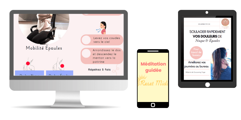 • 1 Guide-pratique de 10 postures de yoga de bureau (incluant des recommandations pour les douleurs chroniques, des instructions de posture et de respiration, et plus encore!)