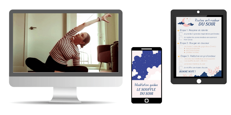 • 3 vidéos express de yoga doux ciblé (5 min chaque) pour :