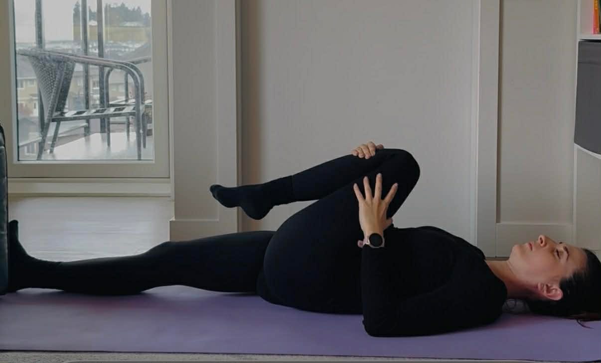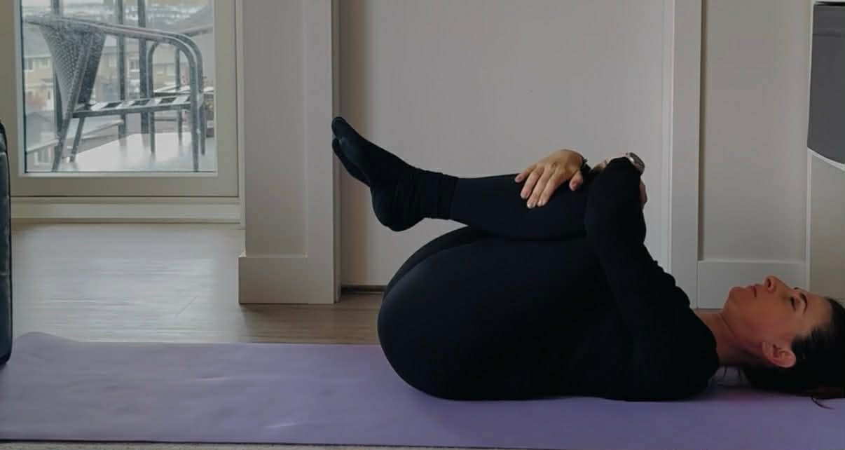 1. On your mat, lying on your back, knees bent, slowly rock your pelvis side to side (while breathing in and out at your own pace)